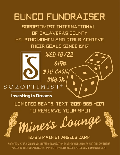 We’re hosting our Annual BUNCO Fundraiser at the Miner's Lounge in Angels Camp on October 22, and you’re invited! The fun starts at 6PM! $30 Cash Buy-In!